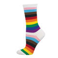 Step into solidarity and style with these bold Progressive Pride Flag Striped Socks. Featuring vibrant rainbow stripes along with black, brown, light blue, pink, and white - each color proudly represents the diversity and unity of the LGBTQ+ community.