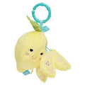 Fruity fun for little ones on the go! This lemon travel toy has embroidered facial features and a zippered compartment that holds three soft fabric lemon slices. Tethered by silky-soft ribbons, each slice include three unique features - rattle, squeaker and crinkle textures. It easily attaches to carriers, strollers, cribs and more with its textured plastic C-clip that doubles as a teether. Great for on-the-go play while encouraging motor development and cause and effect learning.