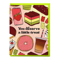 Card reads "You Deserve A Little Treat" and features illustrated snacks including a rainbow cookie, iced coffee, matcha, gummy bears, a black and white cookie, seltzer, a pink sprinkled donut, and a plethora of snack cakes.