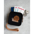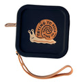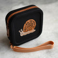 Super nifty square zipper pouch (wristlet! coin purse! key container! secret little stash bag! world's cutest retainer case?) made of black food grade silicone with a satisfyingly chunky light brown plastic zipper and wrist strap. Screen printed with a stressed out snail just trying to get their shit together (which they can now do, with the help of this pouch. Phew!)