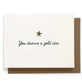 Handmade note card with an actual gold foil star sticker above "you deserve a gold star", screen printed in metallic brown ink.