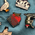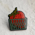 • 1" wide lapel pin in matte black metal and soft enamel with glossy epoxy coating