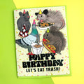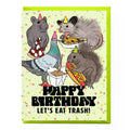 Send birthday wishes to your favorite foodie with this selection of snack-obsessed animal icons. Card reads "Happy Birthday! / Let's Eat Trash!" and features illustrations of a pizza-loving rat, a pigeon with takeout, a squirrel with a hot dog, and a possum feasting on nachos.