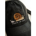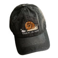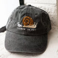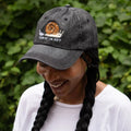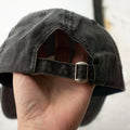 Unstructured, 6 panel baseball hat (AKA "dad hat") in pigment dyed vintage black with design embroidered on the front. Adjustable strap back with metal clasp.