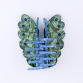 A gorgeous colorful hair claw shaped as a Peacock, a beautiful bird who becomes fascinating when he is cartwheeling to impress the ladies… Mother Nature gave it all when she created this animal! In pearly blue and emerald green tones, with pretty golden ink details inside and out. We felt very inspired while creating this unique accessory.
