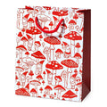 This pattern of red mushrooms has little gnomes hiding amongst them. This design is simple enough to use for any occasion and brings some cheer to your gifting. Design is red on an off-white background, with red sides. This bag can hold books, candles, or anything else you need to gift!