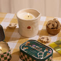 Featuring beautifully hand-painted food icons, these candles are not only aromatic but also a visual delight and come packaged in delightful sliding boxes. The container is also food safe!