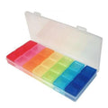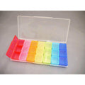 Easily organize a week's worth of medicine or vitamins with this 7 day color coded pill case. Each color row contains 3 square compartments, convenient for organizing by days of the week. This compact sized pill case is perfect to bring along when travelling. Also perfect for organizing beads, jewelry, and more.