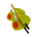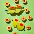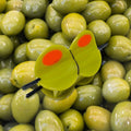 Featuring two martini olives on a toothpick with bright red pimento details, this playful hair claw is perfect for cocktail enthusiasts and olive lovers alike. Handmade and hand-painted from plant-based, plastic-free cellulose acetate, it measures 4" x 2" with unique color variations. Whether you’re shaken, stirred, or simply styled, this clip adds a fun twist to any look!