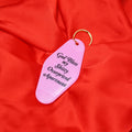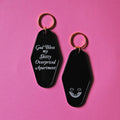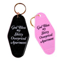 Vintage inspired motel keychain says God Bless my Shitty Overpriced apartment.
