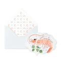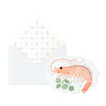 A petite greeting card with die-cut interactive elements. Devein the shrimp for a shitty compliment.