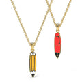 The epistolary debate of pen versus pencil lives on in necklace form. This double-sided pendant necklace let's you choose which colorful side to wear. Yup, that's right—two designs for the price of one. Hangs on an 18k gold-dipped 20" chain (50.8 cm) with clasp. Presented in a unique glass vial that is perfect for gifting. Pendant is about .75" (2 cm). 18k gold-dipped 20" (50.8 cm) chain.