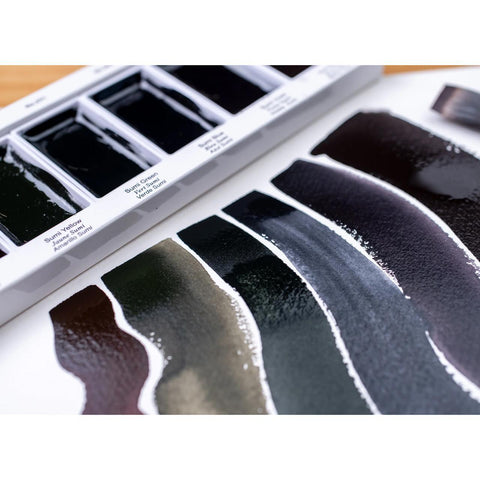 Kuretake started as a sumi ink manufacturer, and they still offer the subtle and powerful black inks that are an important part of Japanese history and culture. This set of watercolors pays homage to Kuretake's ink-making history with six deep, muted tones that start out nearly black and dilute to a range of lovely hues.