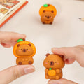 Why settle for a normal pencil sharpener when you can have one of these lil cuties on your desk? Style is chosen at random, but your capy sharpener will either be holding an orange, or wearing one!