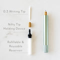 The Lumos Mini solves this problem - a beautiful and infinitely refillable fineliner, writing, and brush pen, including 9 professional artist's tips and 2 writing tips. Its refillable system allows you to customize your pen with a variety of nibs and ink colors, reducing waste and empowering you to create without compromise.