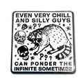 It is not written anywhere in the silly guy constitution that a silly person may not ponder the infinite! This 3cm square enamel pin is for chill and silly people who also possess unimaginable depth. This handsome enamel pin is made of metal with black nickel plating and measures about 3cm x 3cm. It features a deluxe locking clasp and comes packaged on a cute little card, for your safety and amusement.