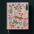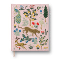 This embroidered sketchbook is a large, hardcover journal with 108 unlined pages of thick paper perfect for sketching, drawing, and journaling. The cover is wrapped in pink cream book cloth and embroidered with an enchanted forest scene with metallic gold accents. An attached grosgrain ribbon bookmark will save your place.