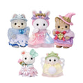 Set includes Chocolate Rabbit baby Grace in Unicorn Princess costume, Husky baby Linnea in Ice Princess costume, Cat baby Apricot in Magical Princess costume, Marshmallow Mouse baby Mary in Fairytale Princess costume and Persian Cat baby Bonnie in Butterfly Princess costume! Costumes are removable and interchangeable with other baby figures from Calico Critters!