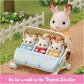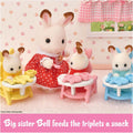 Welcome the Hopscotch Rabbit cradle baby triplets to Calico Village! Set includes 3 posable Hopscotch Rabbit Triplets Phillip, Fauna and Flora who are dressed in removable onesies. Care for the newborn triplets at lunchtime and naptime! This ready to play set features rocking triple cradle with three blankets, three sets of highchairs and three sets of matching feeding accessories including plates, cups and cutlery. Expand your collection of triplets figures and play together with the Marshmallow Mouse Triplets and Persian Cat Triplets. Collect more triplet accessories including the Crib with Mobile and Triplets Stroller!