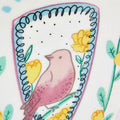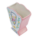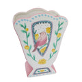 A fan shape creates a graceful and elegant silhouette and a scalloped edge adds some texture and detail to the design. The vase is adorned with a bird motif in green, pink, white, blue, and yellow. There are no drainage holes, making it versatile for different uses. It can be used as a decorative vase for flowers, branches, or greenery. It is made of dolomite - a type of ceramic that is smooth, glossy, and durable.