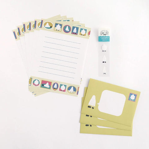 Letter set with cute illustrations of ghosts that will make you giggle! A series of colorful pop-color designs of ghosts dressed up in shoes and socks. The address part of the envelope is designed to look as if the ghosts are having a conversation. Also includes 3 clear sealing stickers to complete the look.