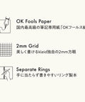 Inside, you’ll find 160 pages of OK Fools Paper - Japan’s finest writing paper known for its smooth texture, gentle ink absorption, and fountain pen compatibility. The subtle 2mm grid pattern includes helpful guides for dividing pages both vertically and horizontally, offering just the right balance of structure and creative freedom.